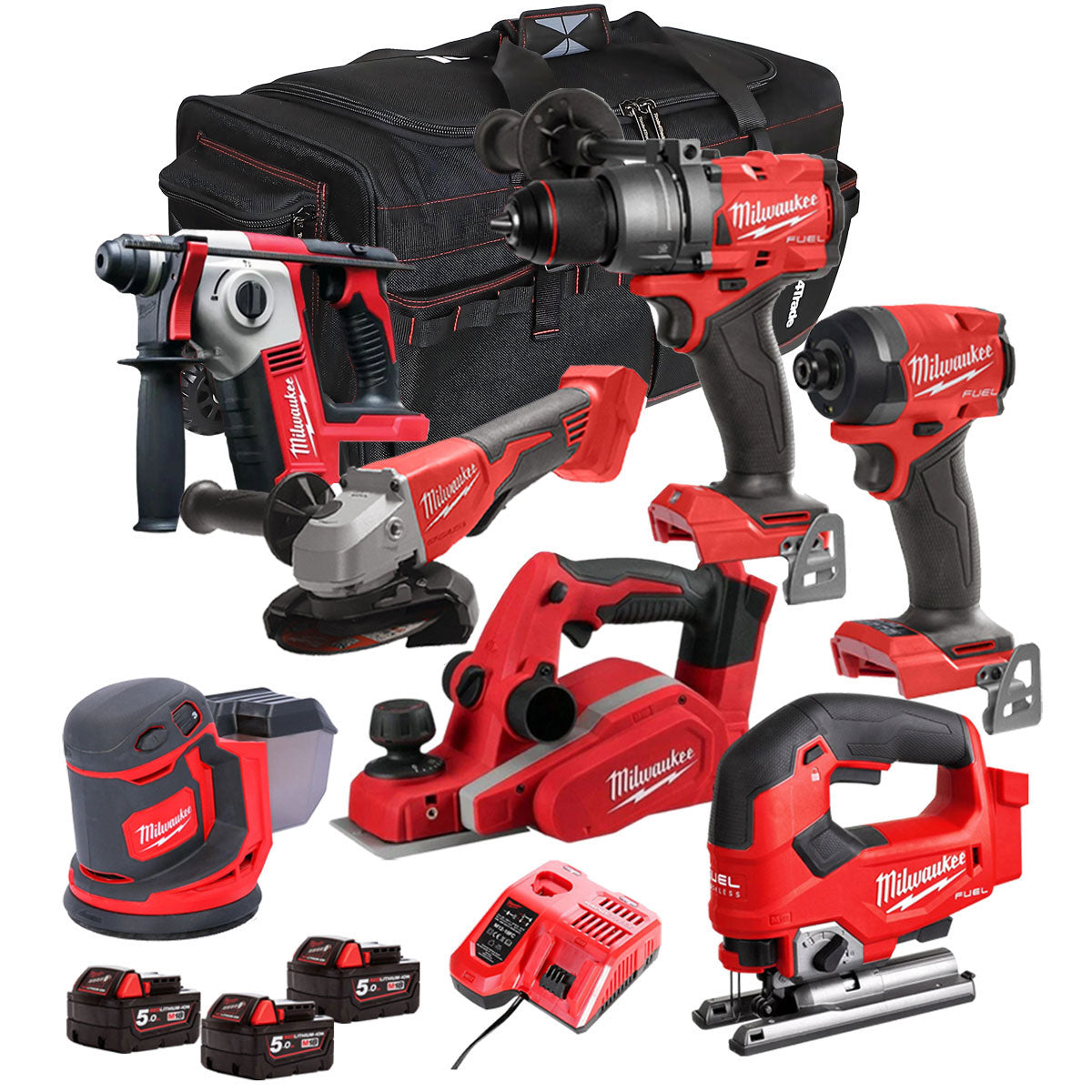 Milwaukee 18V Cordless 7 Piece Tool Kit with 3 x 5.0Ah Batteries & Charger in Bag T4TM-19